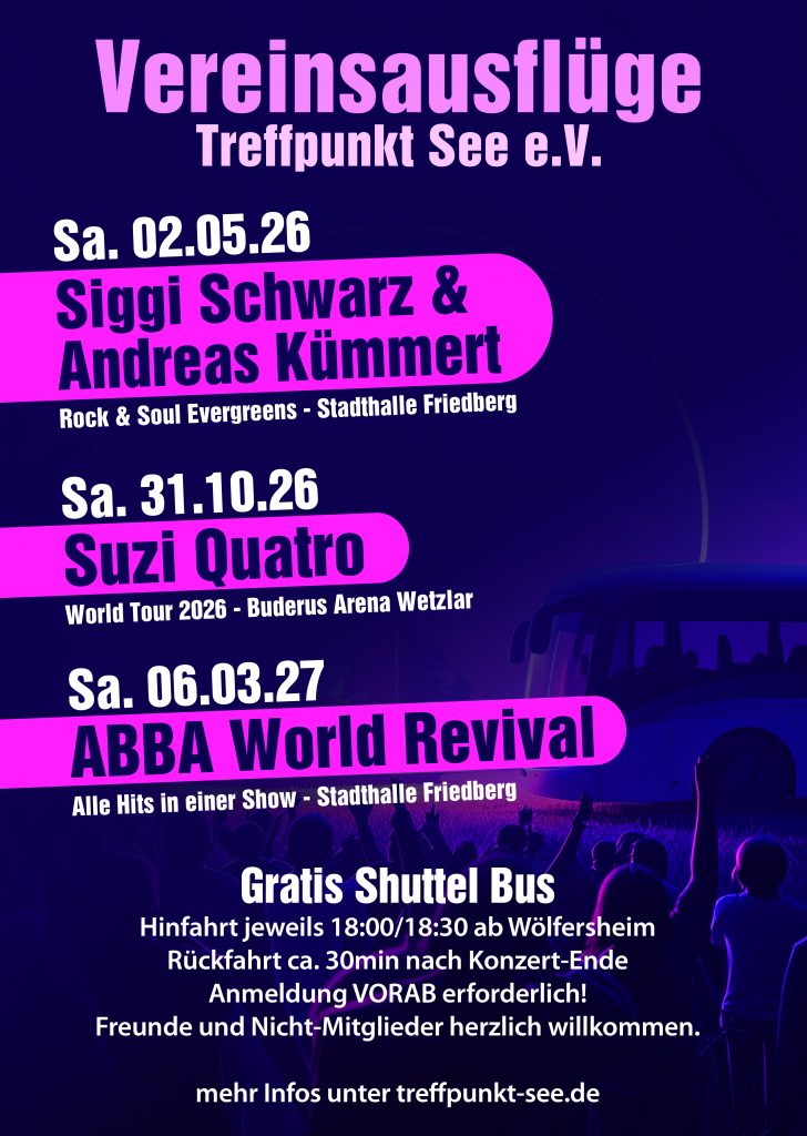 nach dem großen Zuspruch bei unseren Ausflügen im letzten Jahr planen wir auch in diesem Jahr und darüber hinaus weitere Vereinsfahrten. Wie bisher bieten wir dafür einen kostenlosen Shuttle-Bus zu den folgenden Konzerten an.