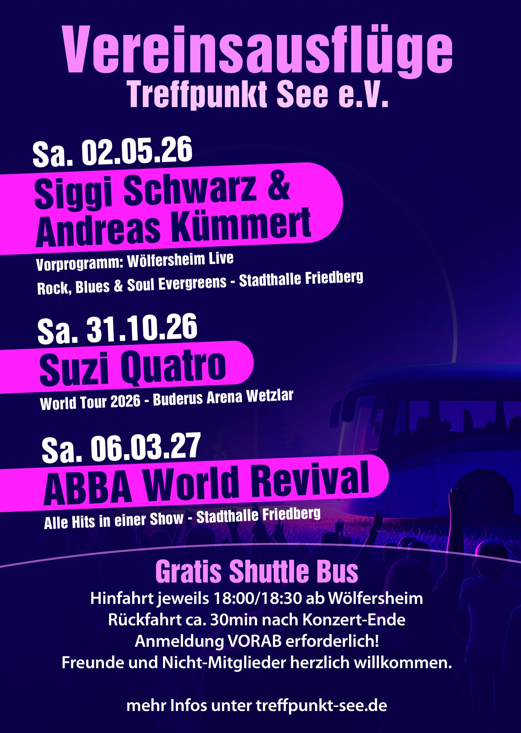 Abfahrt des Busses ist jeweils um 18:00 Uhr in Wölfersheim. Der genaue Abfahrtspunkt wird noch bekannt gegeben. Rückfahrt ist ca. 30min nach Konzertende